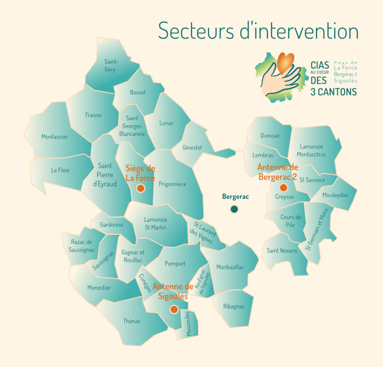 LES SECTEURS D'INTERVENTIONSLe CIAS au Cœur des 3 Cantons dépend du secteur géographique du Bergeracois et intervient sur les communes des cantons du Pays de La Force, Bergerac 2 et Sigoules.